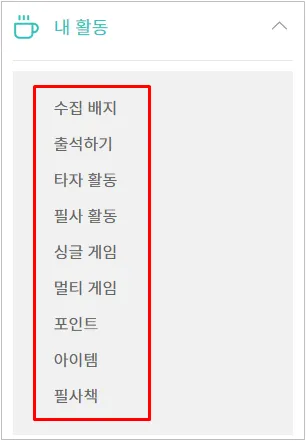 [마이페이지] 좌측 네비게이션 바에서 [내 활동]을 클릭하면 나의 활동 내역과 소유하고 있는 포인트, 아이템, 필사책 등을 확인할 수 있습니다.